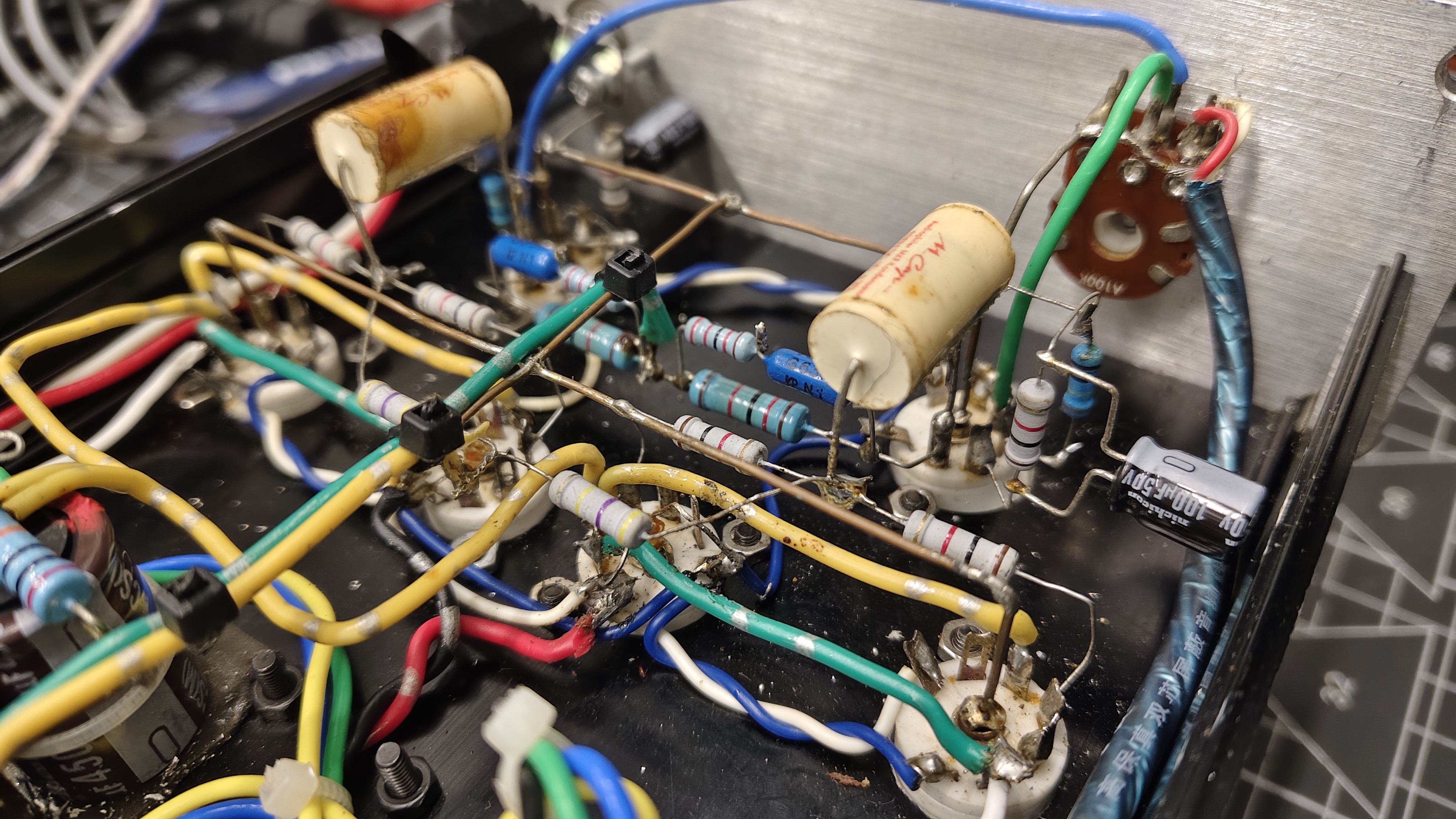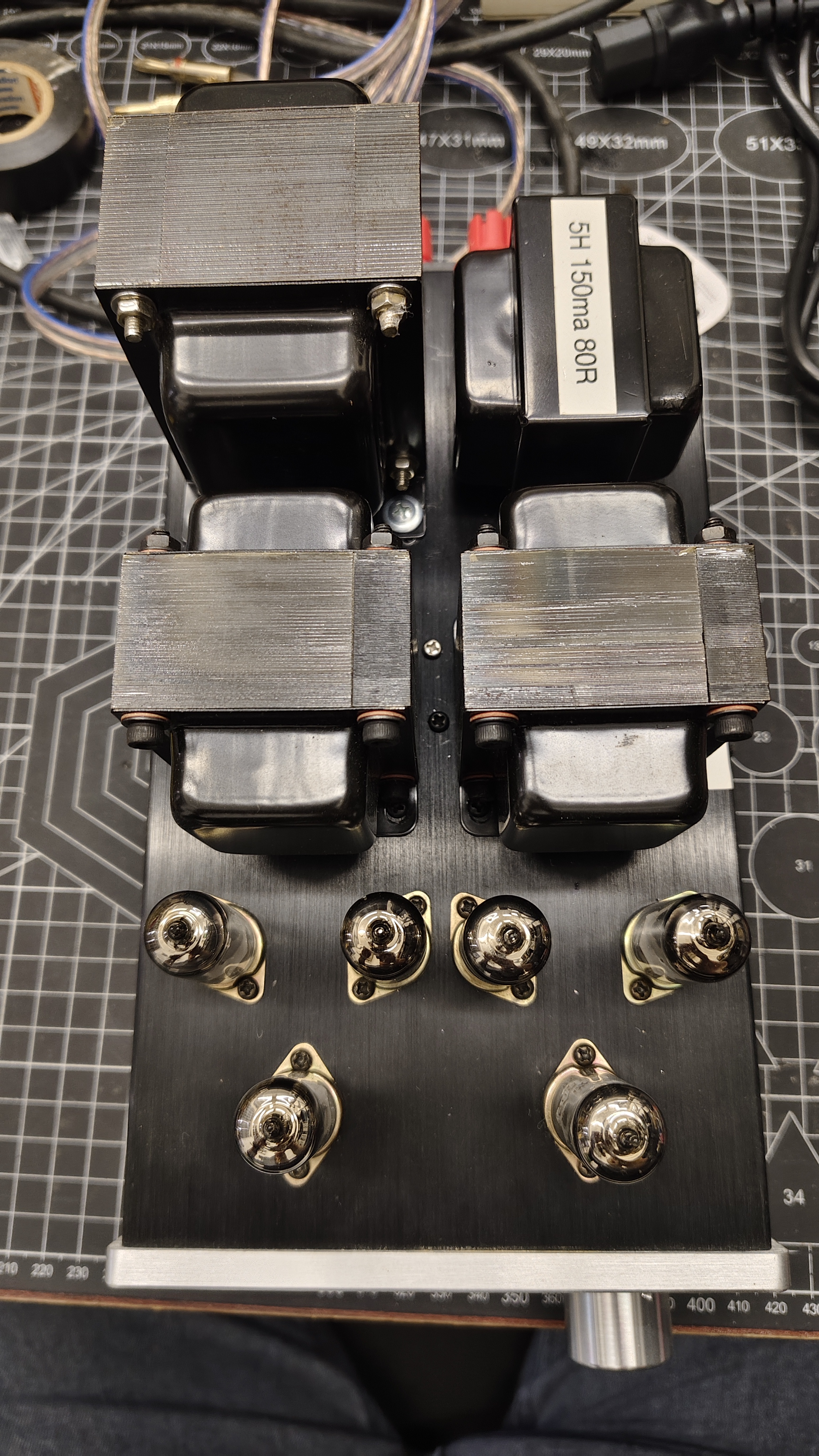 開機試聽,發現拍拍仍然存在,但只在開機頭五分鐘內發生,十分鐘後就沒有了,但聲音大細聲就沒有改善,再細心留意檢查,發現兩支 300B 的燈絲不盡雙同,再看清楚原來細聲那一邊支 300B 燈絲只亮起一半,半邊燈絲不能接通應該是死掉了,只得一半加熱電子產量不足,細聲一點也正常,冷膽時有拍拍聲也可以理解,就換過一對私伙膽再試。
